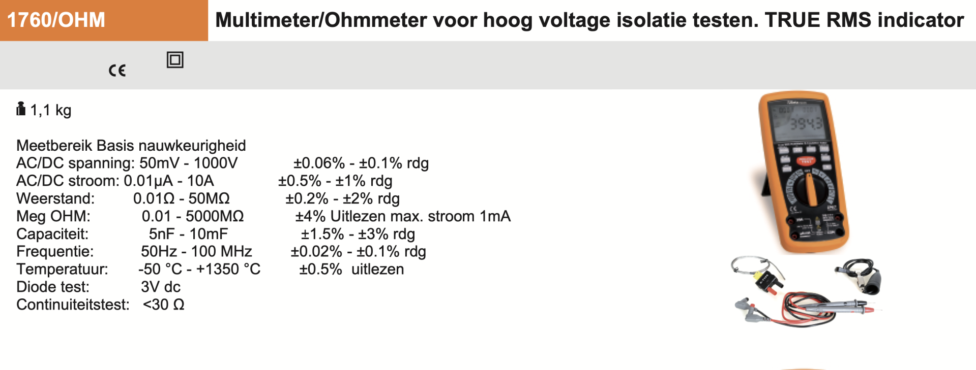 Meg OHM: 0.01 - 5000MΩ ±4% Uitlezen max. stroom 1mA