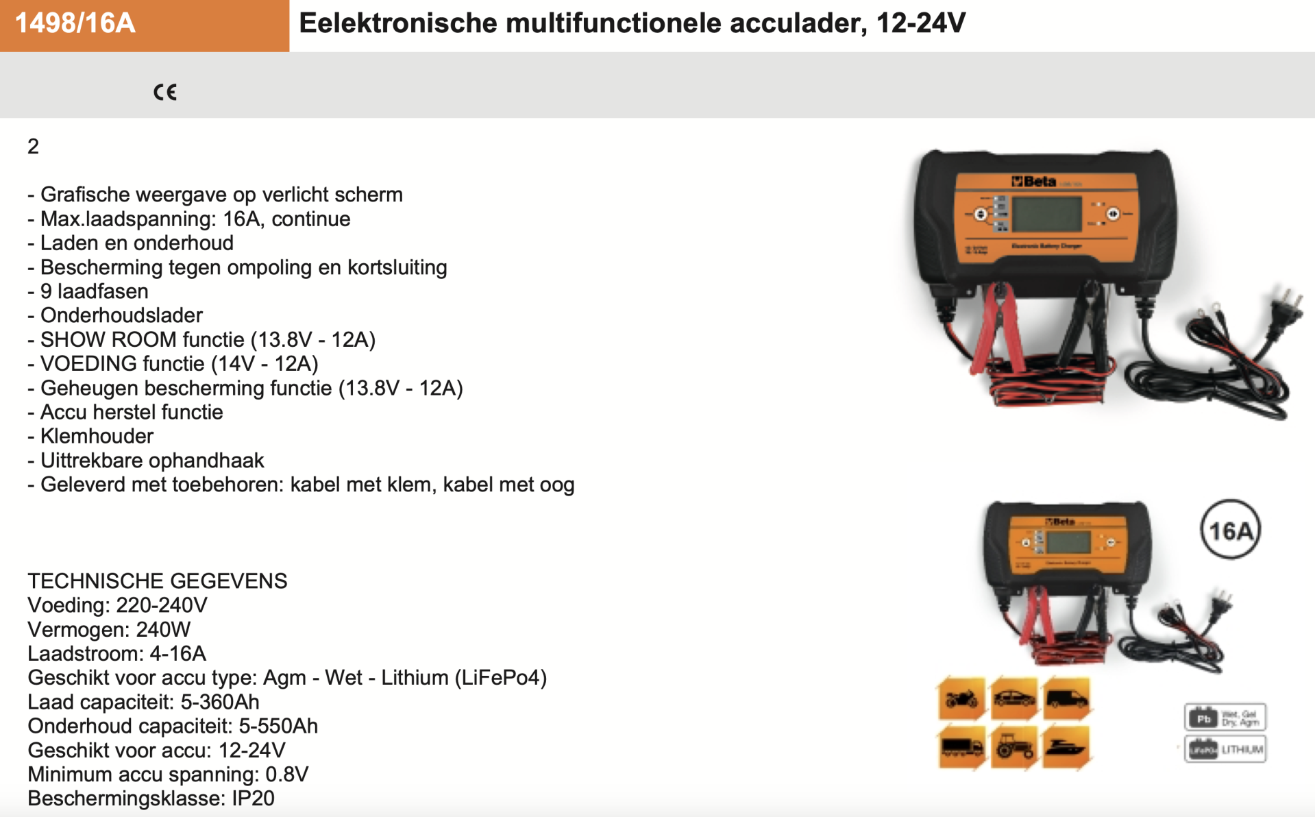 1498/16A Elektronische multifunctionele acculader, 12-24V