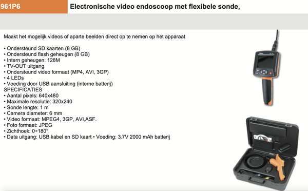 • Data uitgang: USB kabel en SD kaart • Voeding: 3.7V 2000 mAh batterij
