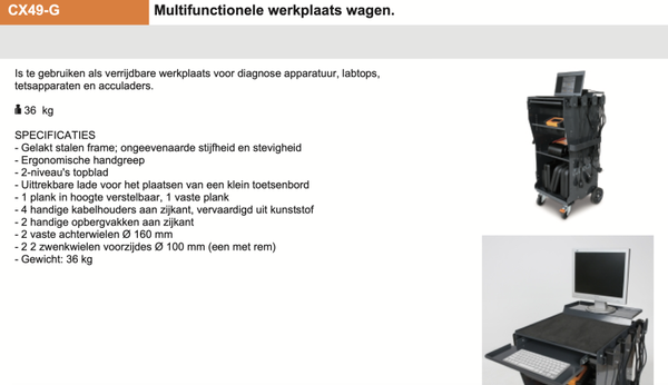 Is te gebruiken als verrijdbare werkplaats voor diagnose apparatuur, labtops, tetsapparaten en acculaders.