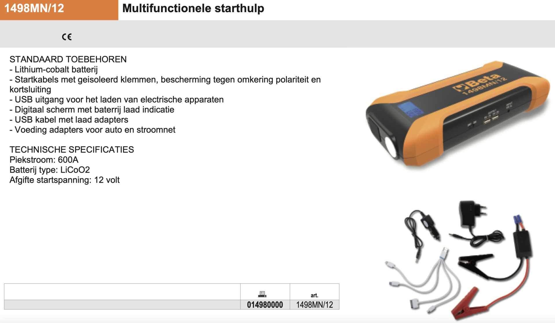 - Startkabels met geisoleerd klemmen, bescherming tegen omkering polariteit en kortsluiting