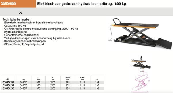 3050/600 Elektrisch aangedreven hydraulischhefbrug, 600 kg