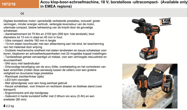 - Geleverd in harde kunststof koffer met 2 lithium ion accu (5 Ah) en een snellader (80 min)