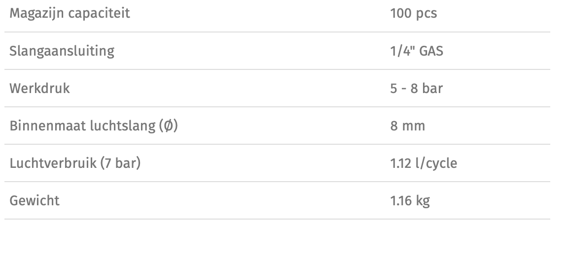 • Gebruikt krammen type 90, sectie 1.25 x 1.0 mm (18-G), lengte 16 - 40 mm, breedte 5.8 mm