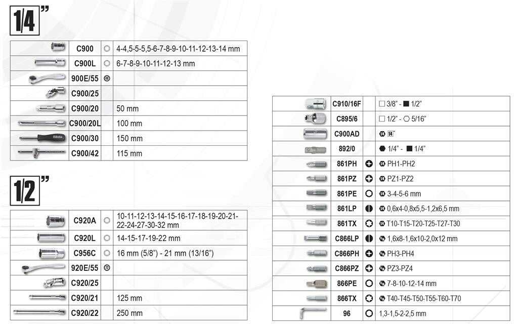 Assortiment van 45 zeskant dopsleutels, 14 toebehoren, 4 haakse stiftsleutels